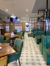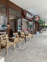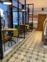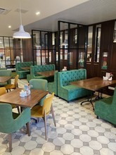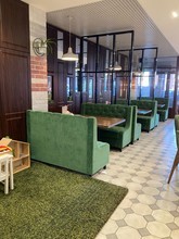 В кафе стильный интерьер, оформленный в жёлто-зеленых тонах. Посетители могут расположиться за столиками возле панорамных окон или на мягких креслах и диванах по центру зала.
